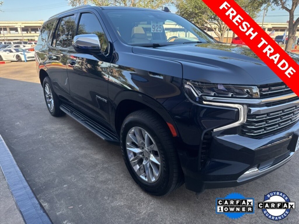 CARFAX One-Owner. Clean CARFAX. Midnight Blue Metallic 2023 Chevrolet Tahoe Premier RWD 10-Speed Automatic with Overdrive EcoTec3 5.3L V8 LOCAL TRADE, CARFAX 1 OWNER, CLEAN CARFAX, NON SMOKER, NAVIGATION, MOONROOF, KEYLESS ENTRY, REMOTE START, APPLE CARPLAY, ANDROID AUTO, SIRIUS XM RADIO, ON STAR, AM/FM/HD RADIO, BLUETOOTH HANDS FREE CALLING, FRONT USB CHARGING PORTS, REAR USB CHARGING PORTS, MP3 IPOD COMPATIBLE, AUTO HEADLIGHTS, DAYTIME RUNNING LIGHTS, BLIND SPOT WARNING SYSTEM, REAR TRAFFIC ALERT, LANE DEPARTURE WARNING SYSTEM, POWER ADJUSTABLE DRIVERS SEAT, POWER ADJUSTABLE PASSENGER SEAT, HEATED SEATS, LEATHER INTERIOR, 2ND ROW CAPTAINS CHAIRS, 3RD ROW SEATING, RUNNING BOARDS, TOW PKG, Jet Black/Maple Sugar Leather, 1st & 2nd Row Color-Keyed Carpeted Floor Mats, 3rd Row 60/40 Power-Folding Split-Bench Seat, Auto-Dimming Inside Rear-View Mirror, Bose 10-Speaker Centerpoint Surround Audio Sys Ft, Bright Front & Rear Door Sill Plates, Chrome Door Handles w/Body-Color Strip, Chrome Mirror Caps, Color-Keyed Carpeting Floor Covering, Driver & Front Outboard Passenger Airbags, Dual Exhaust System, Enhanced Driver Information Center, Floor Console, Hands-Free Rear Power Programmable Liftgate, Heated 2nd Row Outboard Seats, Heated Steering Wheel, Infotainment Display, Lane Change Alert w/Side Blind Zone Alert, LED Daytime Running Lamps, License Plate Front Mounting Package, Memory Settings, Navigation System, Outside Heated Power-Adjustable Mirrors, Power Release 2nd Row Bucket Seats, Power Tilt & Telescopic Steering Column, Preferred Equipment Group 1LZ, Rear Cross Traffic Alert, Remote Start, Safety Alert Seat, SiriusXM Radio w/360L, Universal Home Remote, Wireless Charging, Wrapped Steering Wheel.
