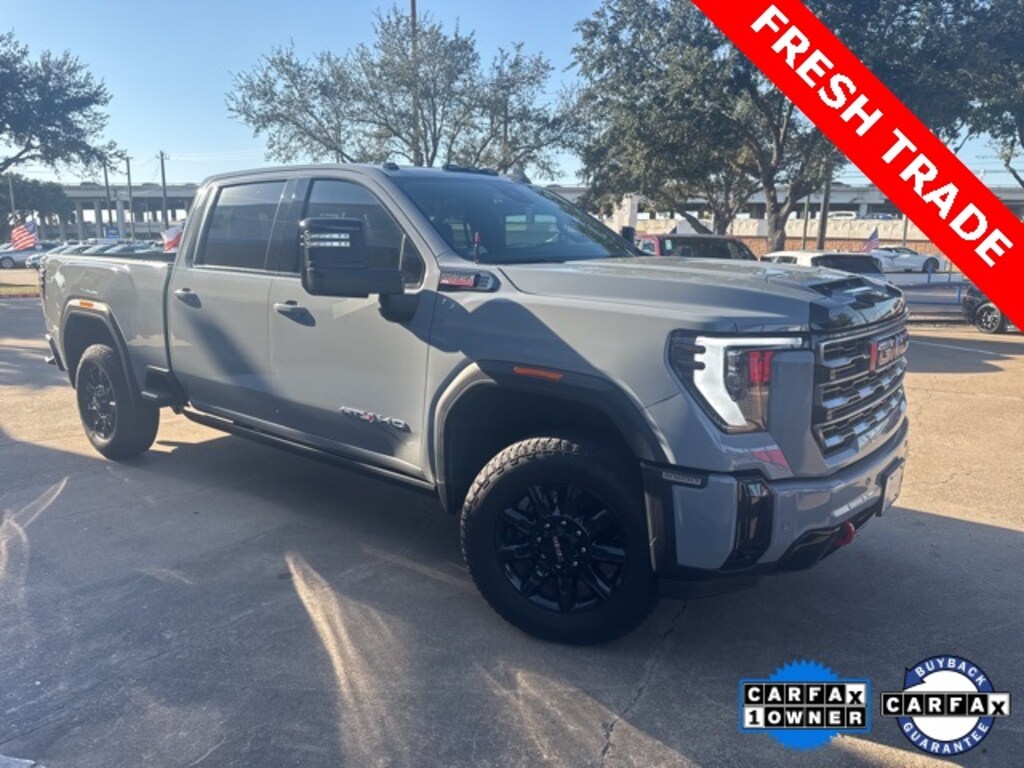 CARFAX One-Owner. Clean CARFAX. Thunderstorm Gray 2025 GMC Sierra 2500HD AT4 4WD 10-Speed Automatic Duramax 6.6L V8 Turbodiesel LOCAL TRADE, CARFAX 1 OWNER, CLEAN CARFAX, NON SMOKER, 4WD, NAVIGATION, VOICE ACTIVATED NAVIGATION, MOONROOF, KEYLESS ENTRY, REMOTE START, APPLE CARPLAY, ANDROID AUTO, SIRIUS XM RADIO, ON STAR, AM/FM/HD RADIO, BLUETOOTH HANDS FREE CALLING, FRONT USB CHARGING PORTS, MP3 IPOD COMPATIBLE, AUTO HEADLIGHTS, DAYTIME RUNNING LIGHTS, BLIND SPOT WARNING SYSTEM, REAR TRAFFIC ALERT, LANE DEPARTURE WARNING SYSTEM, POWER ADJUSTABLE DRIVERS SEAT, HEATED SEATS, LEATHER INTERIOR, RUNNING BOARDS, TOW PKG, 10-Speed Automatic, 4WD, Jet Black With Kalahari Accents Leather, 120-Volt Bed Mounted Power Outlet, 120-Volt Instrument Panel Power Outlet, 2 Charge-Only Rear USB Ports, 2 Charge/Data USB Ports Inside Center Console, 2 USB Ports, 2-Speed Active Transfer Case, AT4 Preferred Package, AT4 Premium Plus Package, Bed View Camera w/2 Trailer Camera Provisions, Bose Premium 7-Speaker Sound System, Deep-Tinted Glass, Electric Rear-Window Defogger, Floor-Mounted Center Console, Front Prem Floor Liners w/Removable Carpet Insert, Front Rain-Sensing Wipers, Gloss Black Header Grille & Grille Insert Bars, Gooseneck/5th Wheel Prep Package, HD Surround Vision, Heated 2nd Row Outboard Seats, Heated Driver & Front Outboard Passenger Seats, Hill Descent Control, Inside Rearview Auto-Dimming Rear Camera Mirror, Keyless Open & Start, LED Cargo Area Lighting, LED Smoked Amber Roof Marker Lamps, Manual Tilt-Wheel/Telescoping Steering Column, Multicolor 15" Diagonal Head-Up Display, Off-Road High Clearance Step (LPO), OnStar Services Capable, Power Front Passenger Windows w/Express Up/Down, Power Sliding Rear Window w/Defogger, Power Sunroof, Preferred Equipment Group 4SB, Push Button Start, Rear Cross Traffic Alert, Rear Prem Floor Liners w/Removable Carpet Insert, Rear Wheelhouse Liners, Remote Vehicle Starter System, Safety Alert Seat, SiriusXM w/360L Trial Subscription, Spray-On Pickup Bedliner w/GMC Logo, Steering Wheel Audio Controls, Technology Package, Trailer Cam Provisions & Trailer Viewing Software, Trailer Side Blind Zone Alert, Ultrasonic Front & Rear Park Assist, Unauthorized Entry Theft-Deterrent System, Universal Home Remote, Ventilated Driver & Front Passenger Seats, Wireless Charging, Wireless Phone Projection, X31 Off-Road Package.